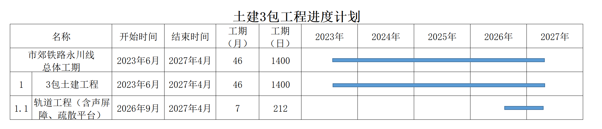 市郊鐵路重慶中心城區(qū)至永川線工程計劃施工總工期60個月。本招標(biāo)項目計劃于2023年6月30日開工,計劃1400日歷天按合同約定實施和完成本承包工程。