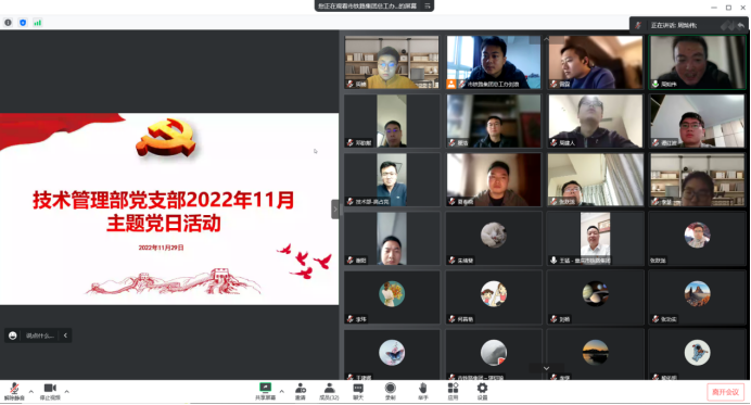 為進一步深入學習貫徹黨的二十大精神,大力弘揚偉大抗疫精神,11月29日上午,集團技術管理部黨支部組織線上開展“聚焦二十大 奮進新征程”主題黨日活動。活動由黨支部書記周燦偉主持,集團黨委委員、總工程師王猛及支部全體黨員、入黨積極分子參加。