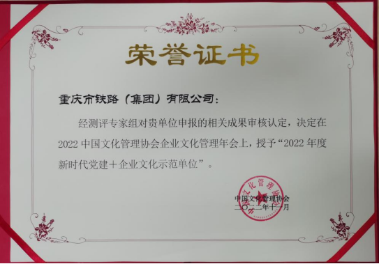 近期,在北京舉辦的中國文化管理協(xié)會企業(yè)文化管理年會上,經(jīng)專家評選,重慶市鐵路集團榮獲2022年度“新時代黨建+企業(yè)文化示范單位”榮譽稱號,集團黨建引領(lǐng)高質(zhì)量發(fā)展再上新臺階。