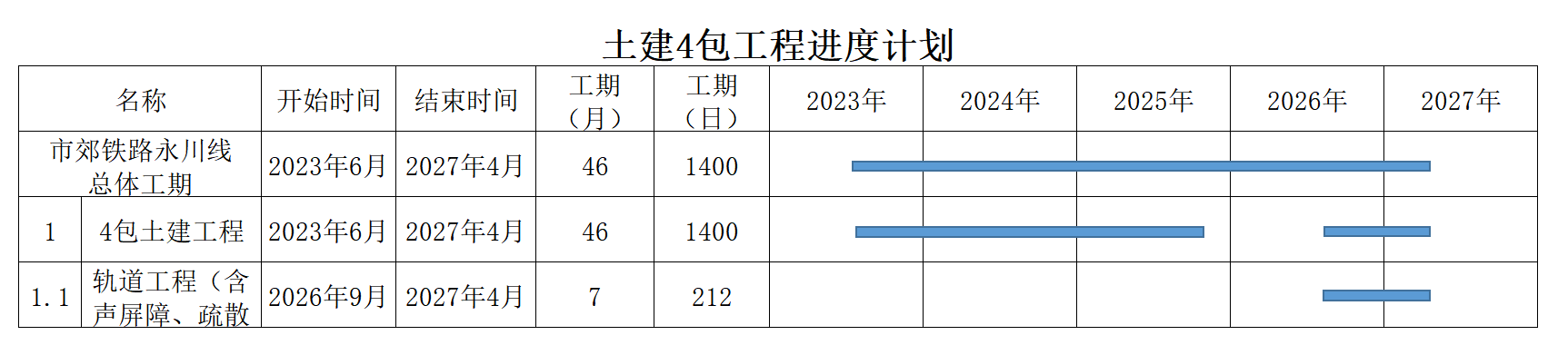 市郊鐵路重慶中心城區(qū)至永川線工程計(jì)劃施工總工期60個(gè)月。本招標(biāo)項(xiàng)目計(jì)劃于2023年6月30日開工,計(jì)劃1400日歷天按合同約定實(shí)施和完成本承包工程。