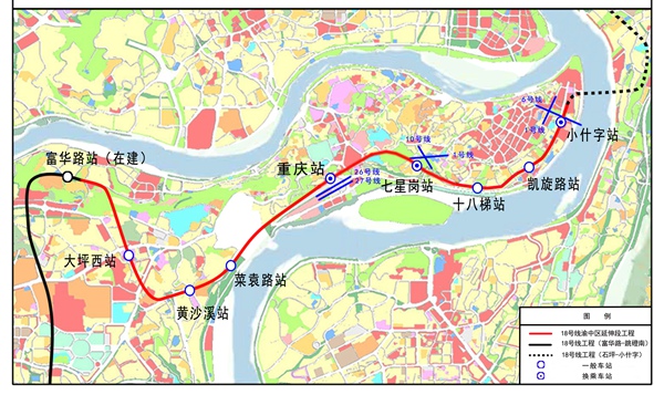 18號線北延伸段(富華路~小什字)全長11公里,投資100億元,設大坪西站、黃沙溪站、菜袁路站、重慶站、七星崗站、十八梯站、凱旋路站、小什字站共8座車站。18號線為重慶市軌道交通線網(wǎng)中的西南-東北向的骨干線路,強化了城市核心區(qū)的快速聯(lián)系。18號線北延伸段為中心城區(qū)加密線,與18號線相接,有效緩解化龍橋、大坪、菜園壩等片區(qū)交通擁堵,填補了渝中半島下半城的軌道空白。